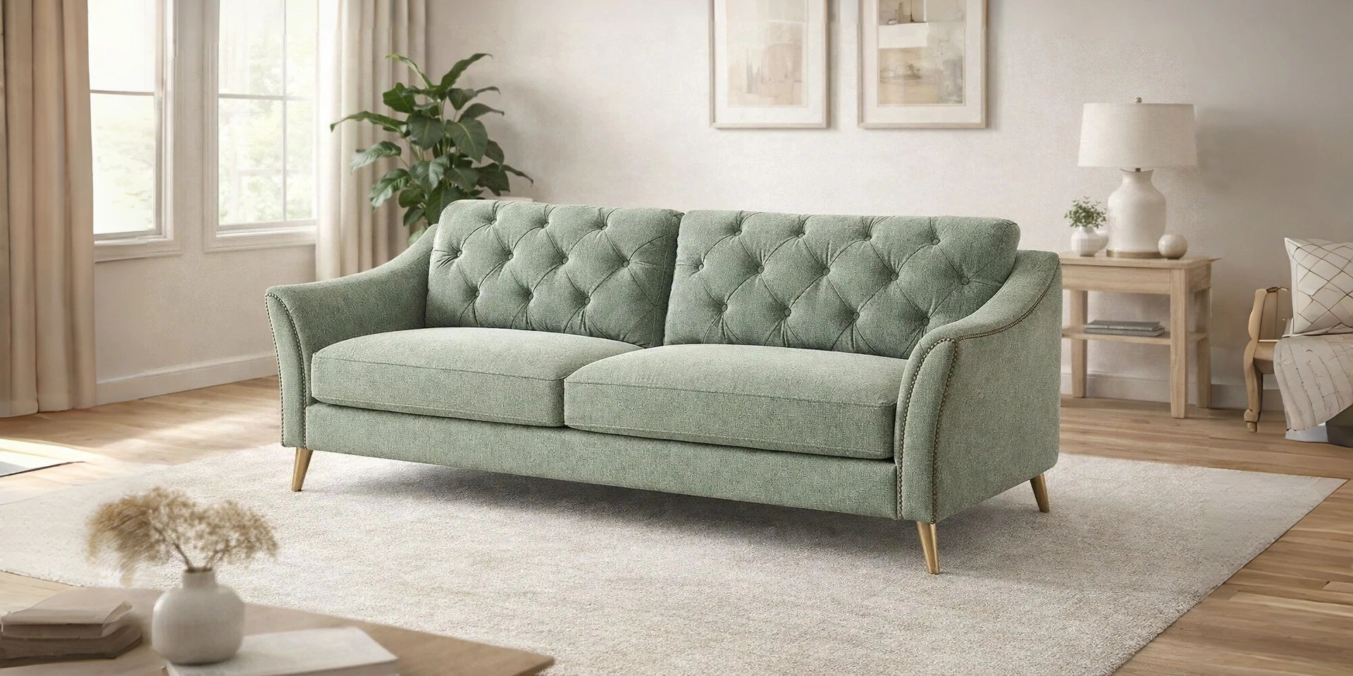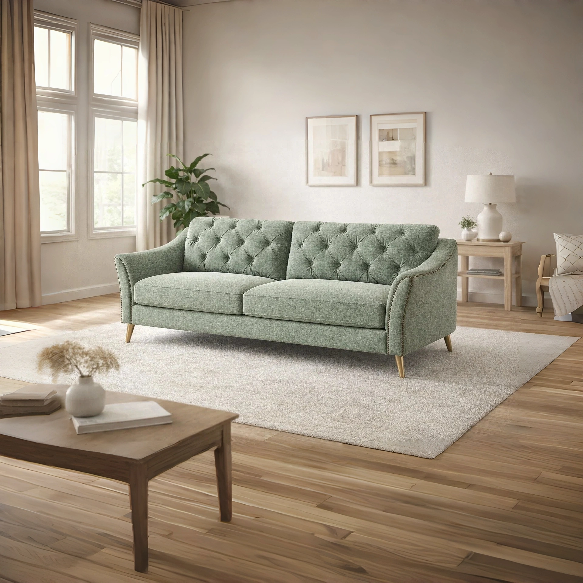 Tapizado en tela verde, estructura estable y diseño adaptable.