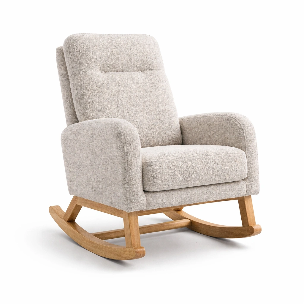 El sillón mecedora cuenta con un marco de roble y está tapizado en tela de poliéster en color beige.