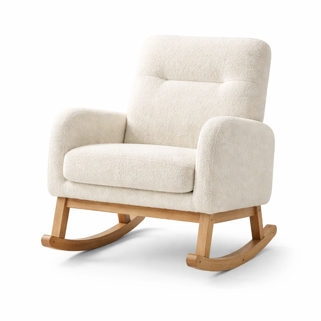Esta silla mecedora tiene un marco de madera de roble y está tapizada en tejido bouclé de 100% poliéster.