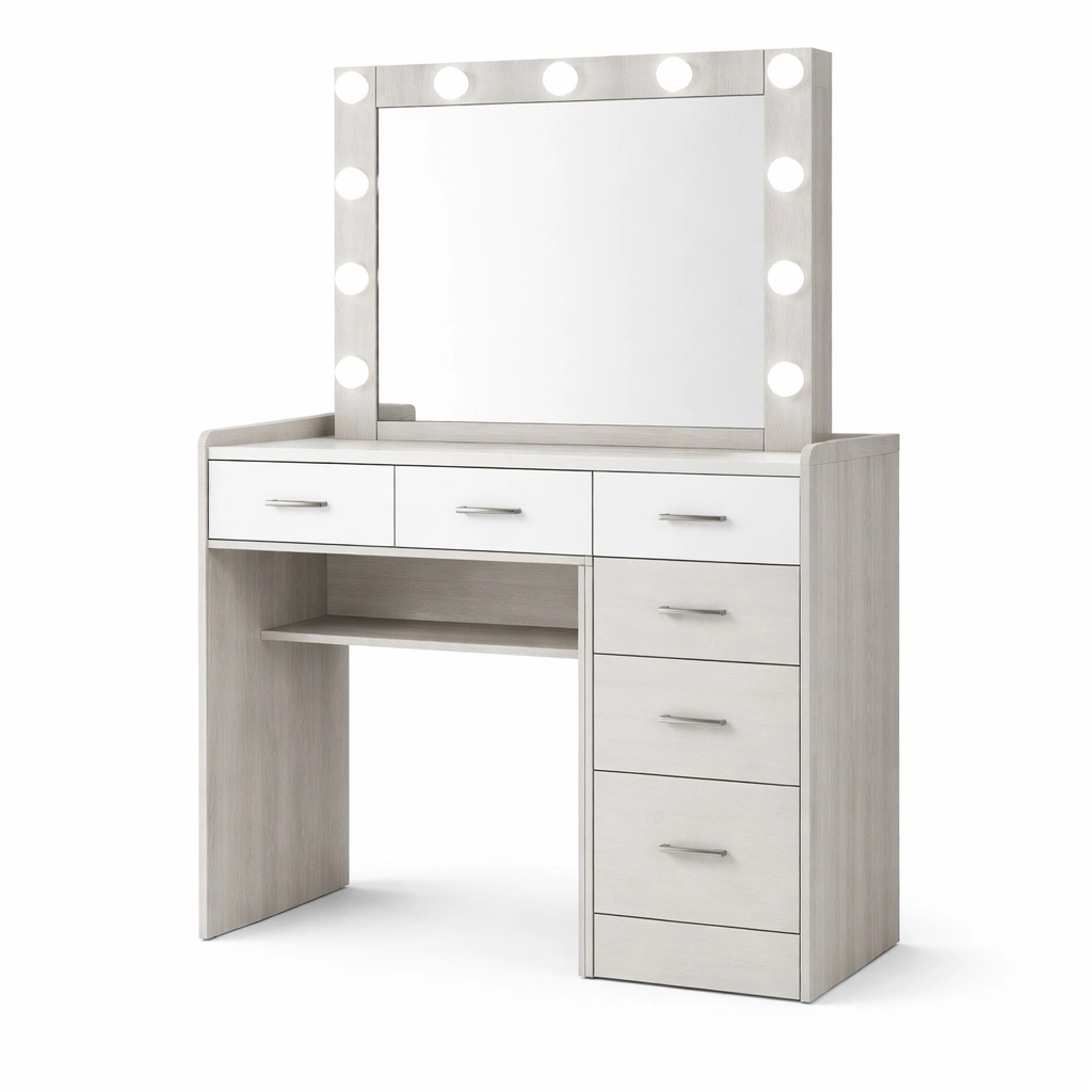 El tocador está fabricado con tableros de partículas laminados. El color principal es Blanco con detalles en Plateado.